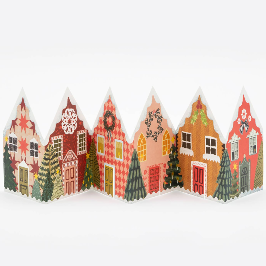 This card folds into a standard C6 envelope and opens out to reveal the full row of Christmas Houses. It is blank overleaf for your lovely festive message.