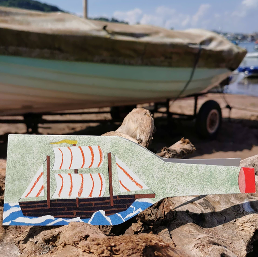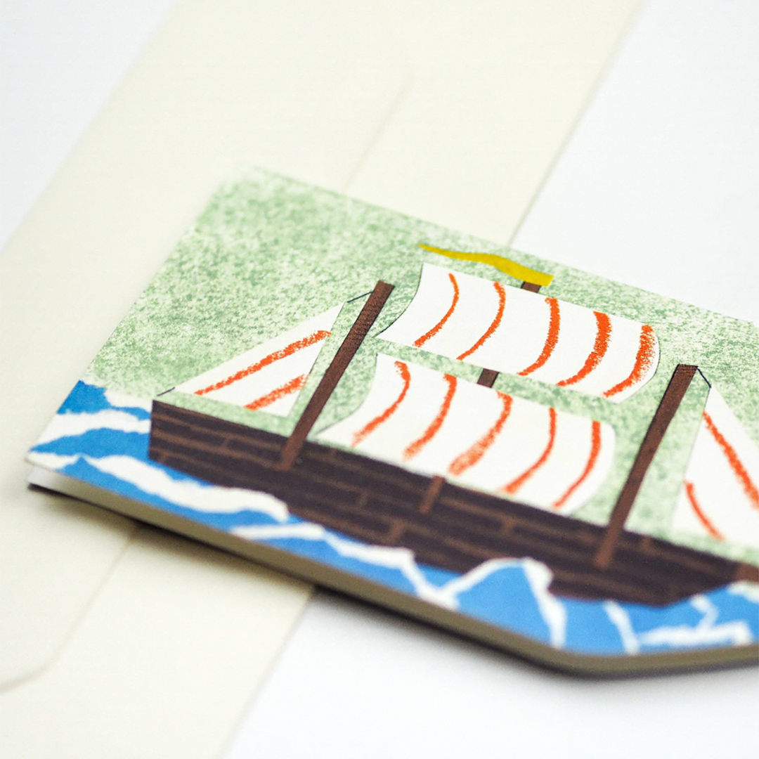 A ship in a bottle! Good for any nautical nuts you may know or for someone taking a trip. This card is cut in to a bottle shape and has a fun, mid-century vibe.