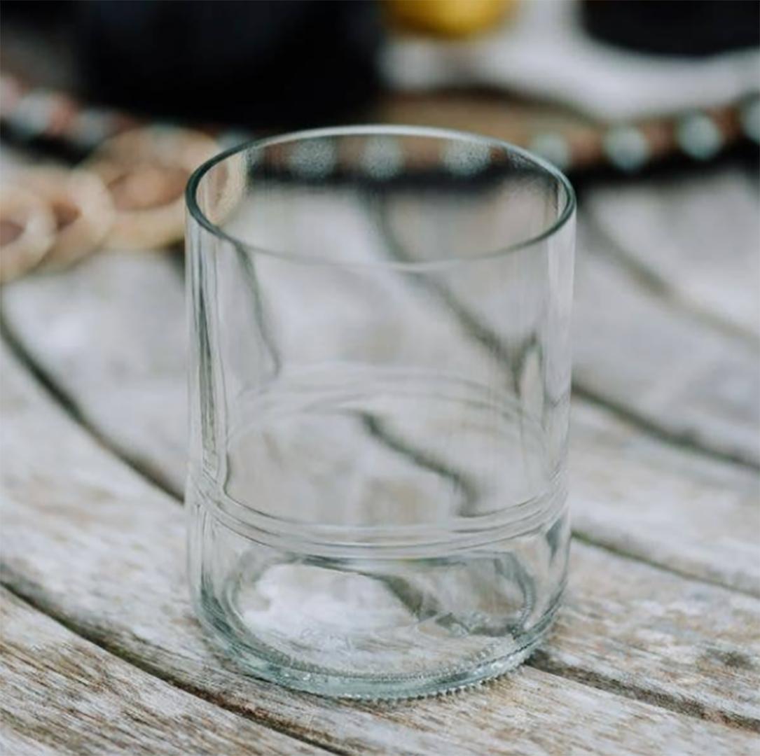 Embrace sophistication and sustainability with our Ripple Tumbler, crafted from repurposed bottle glass. At 10cm tall and 8cm in diameter, it features elegant ripple-like rings, making it perfect not only as an exceptional water glass but also for enjoying a generous G&T. Versatile and eco-friendly, this tumbler combines luxury with a touch of environmental responsibility, adding a splash of elegance to any occasion. Elevate your drinking experience and make a statement in your home with this exquisite glassware piece.