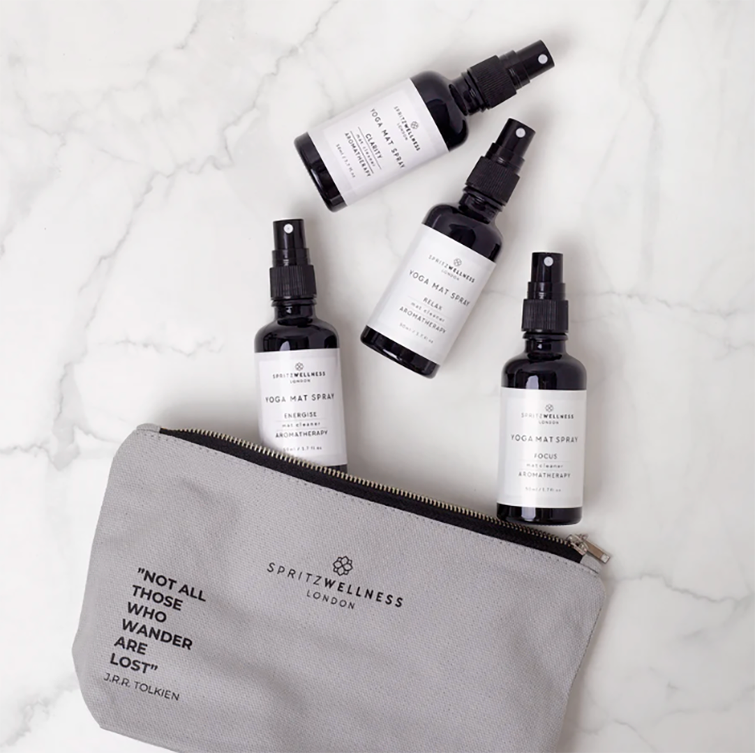A stylish travel bag contains 4 x 50 ml unique yoga mat sprays -